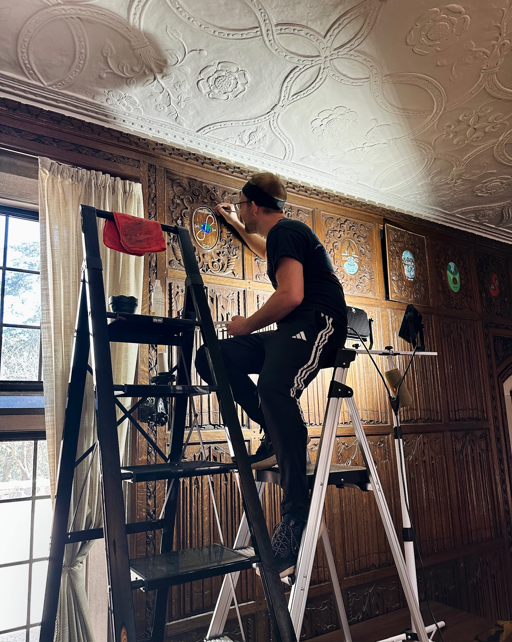 Corey Booth at work on the cartouche, May 2025, photograph by Amy Klein.