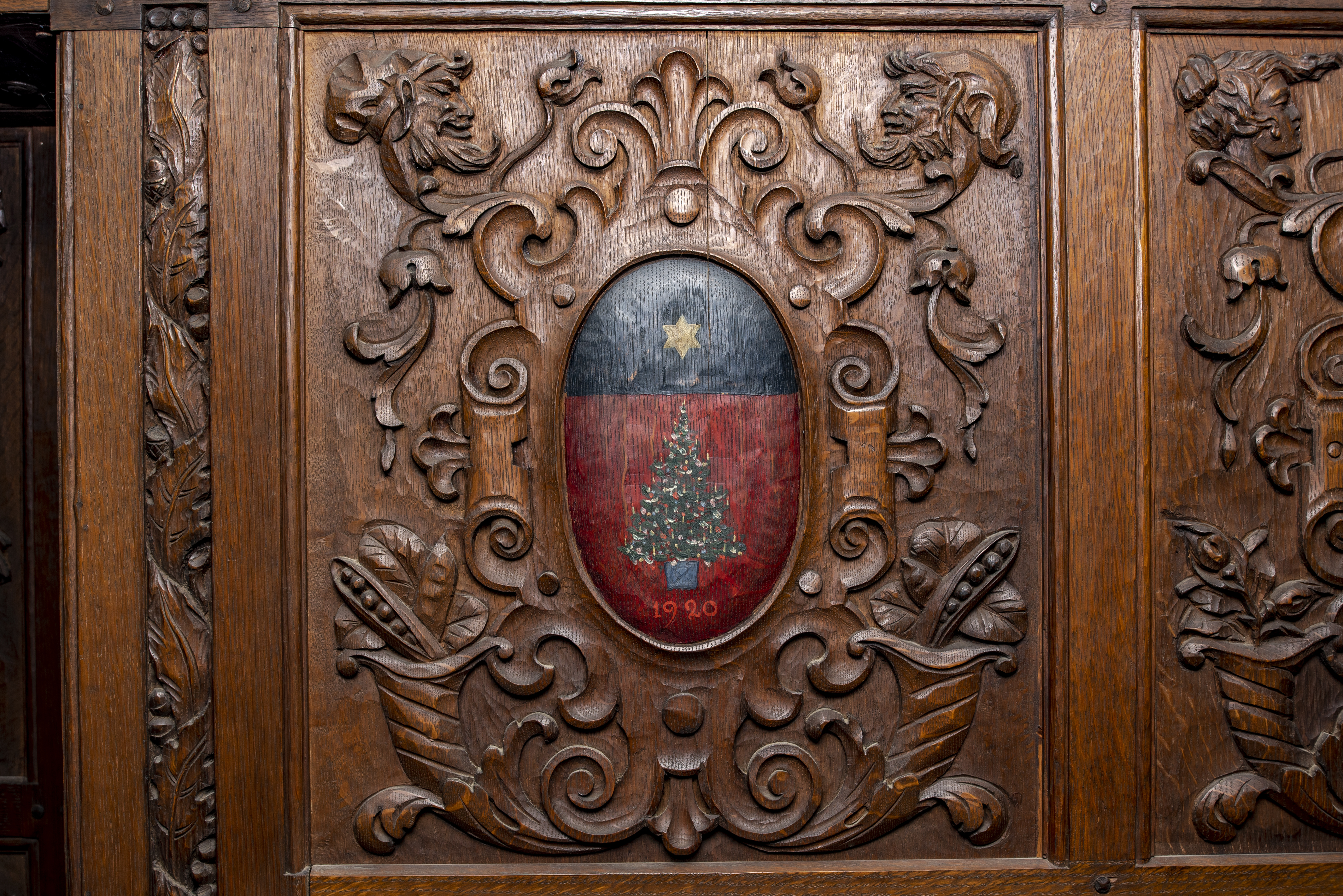 The Booths celebrated Christmas in the Oak Room that year, for the first and only time. A few years later, to commemorate the holiday, their youngest son, Henry Scripps Booth, painted a Christmas tree on one of the panels over the fireplace. Harry took advantage of the empty space at the center of the panel’s cartouche: a smooth, enclosed oval.