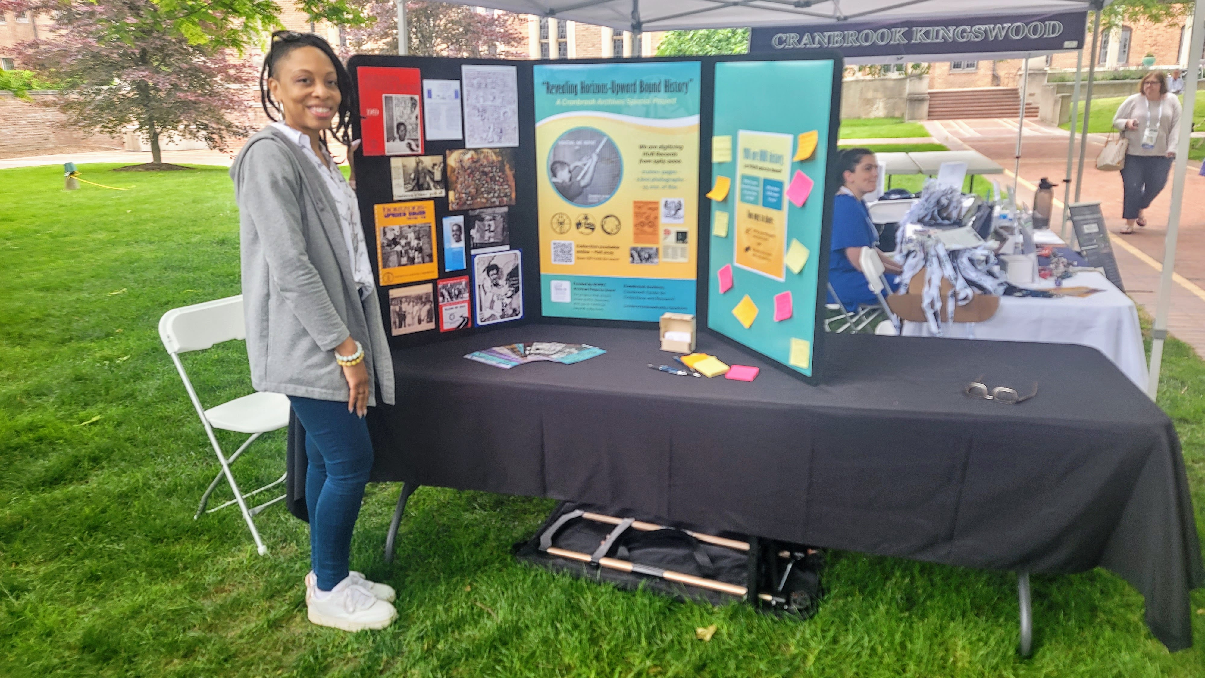 Project archivist Courtney Richardson at HUB display during Cranbrook Schools Reunion Weekend, June 2024. Deborah Rice, photographer. Courtesy of Cranbrook Archives.
