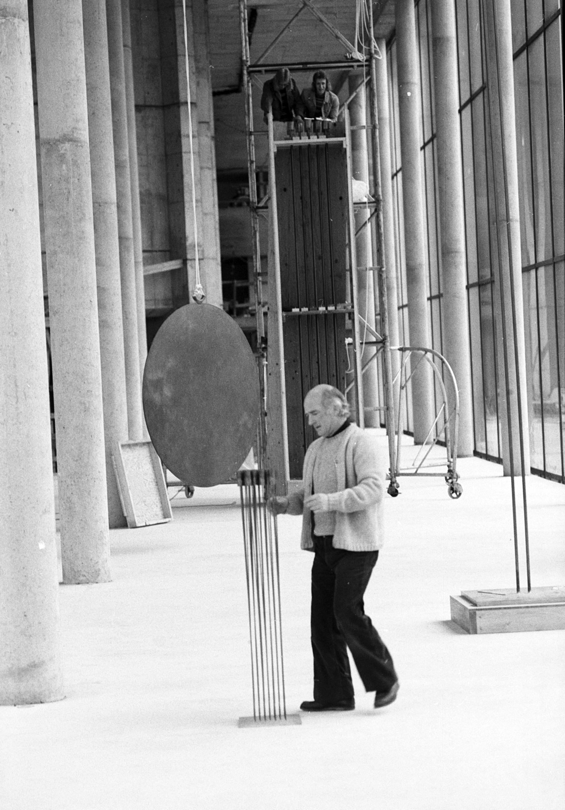 On left: Bertoia installs his sculpture at Grieg Hall, Bergen, Norway, 1976. Clifford West, photographer. On right: Children enjoy outdoor sculpture at, Harry Bertoia, at the Henie-Onstad Foundation, Oslo, Norway, 1977. Clifford West, photographer. Courtesy of Cranbrook Archives.