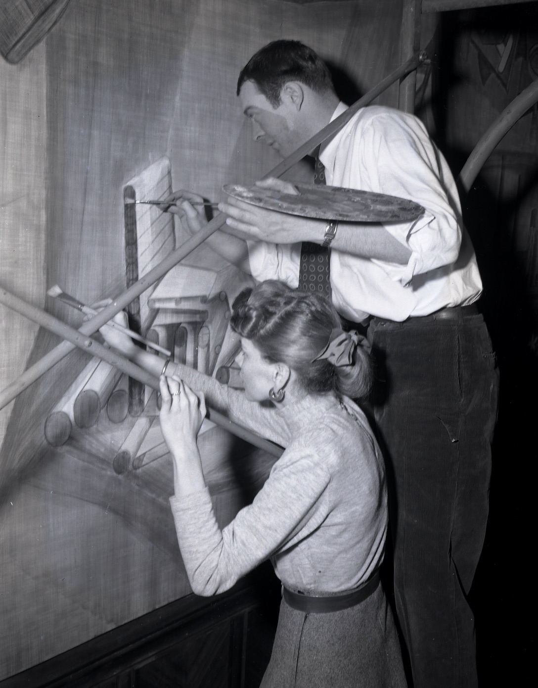 Joy and Clifford painting section on the furnture and paper industries. Cranbrook Archives.