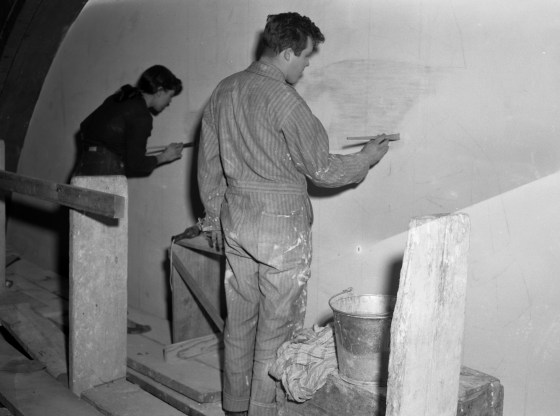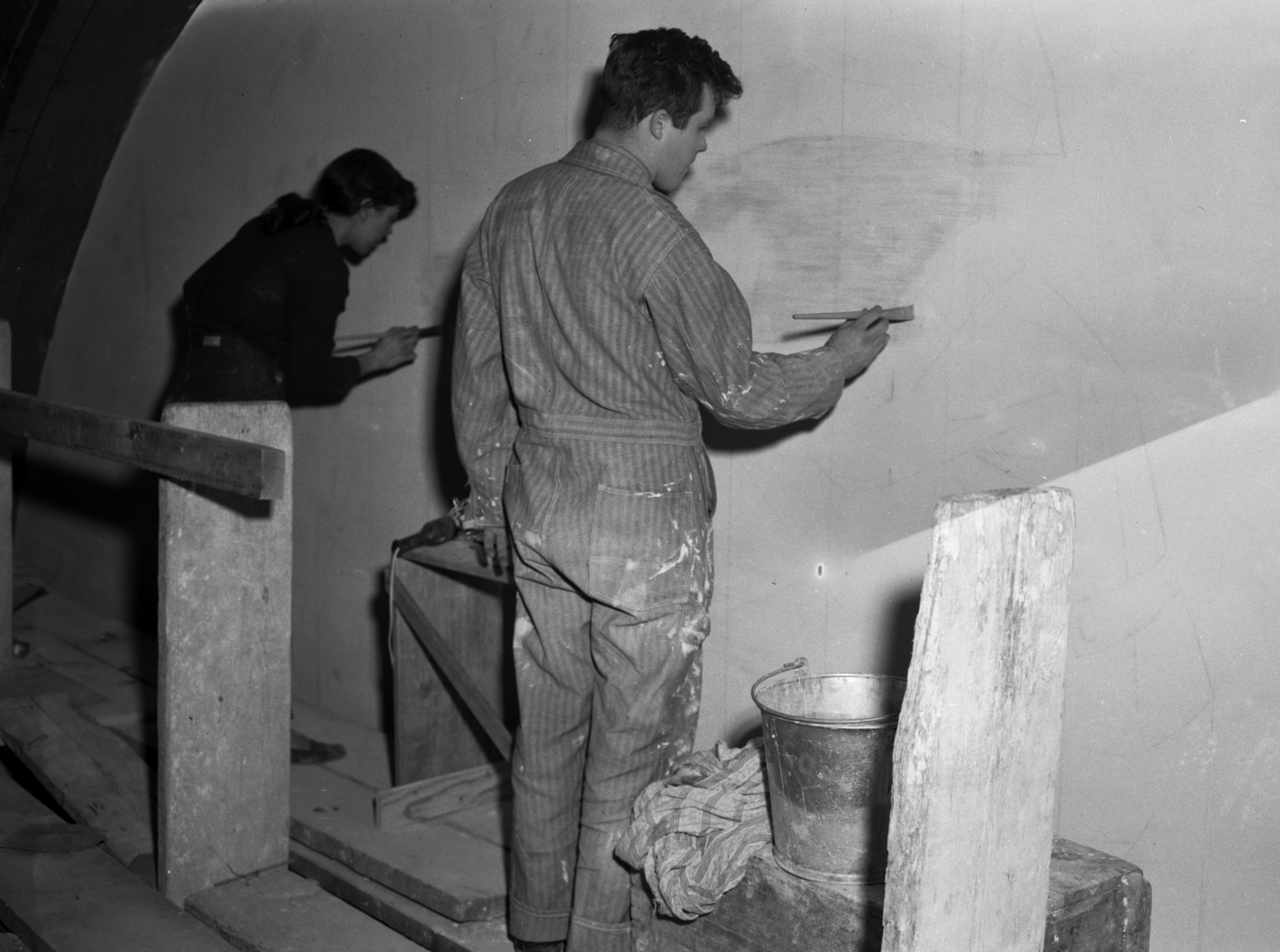 Assistants begin applying the tempera paint. Cranbrook Archives.