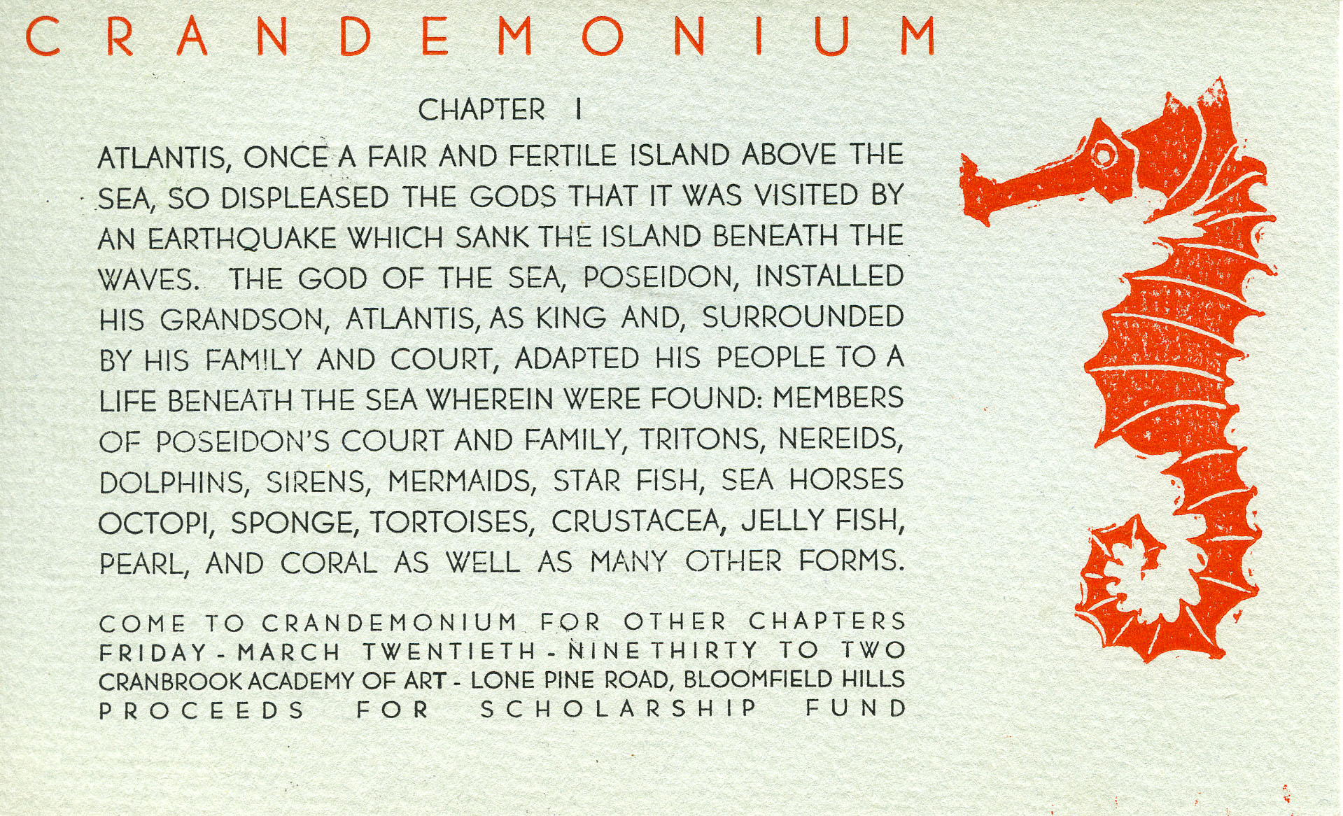 An intriguing invitation to 1936’s Atlantis-themed Crandemonium, this card featured the first part of the story of Atlantis. The invitee would presumably learn the remaining chapters upon attending the party. 1934, Cranbrook Archives.