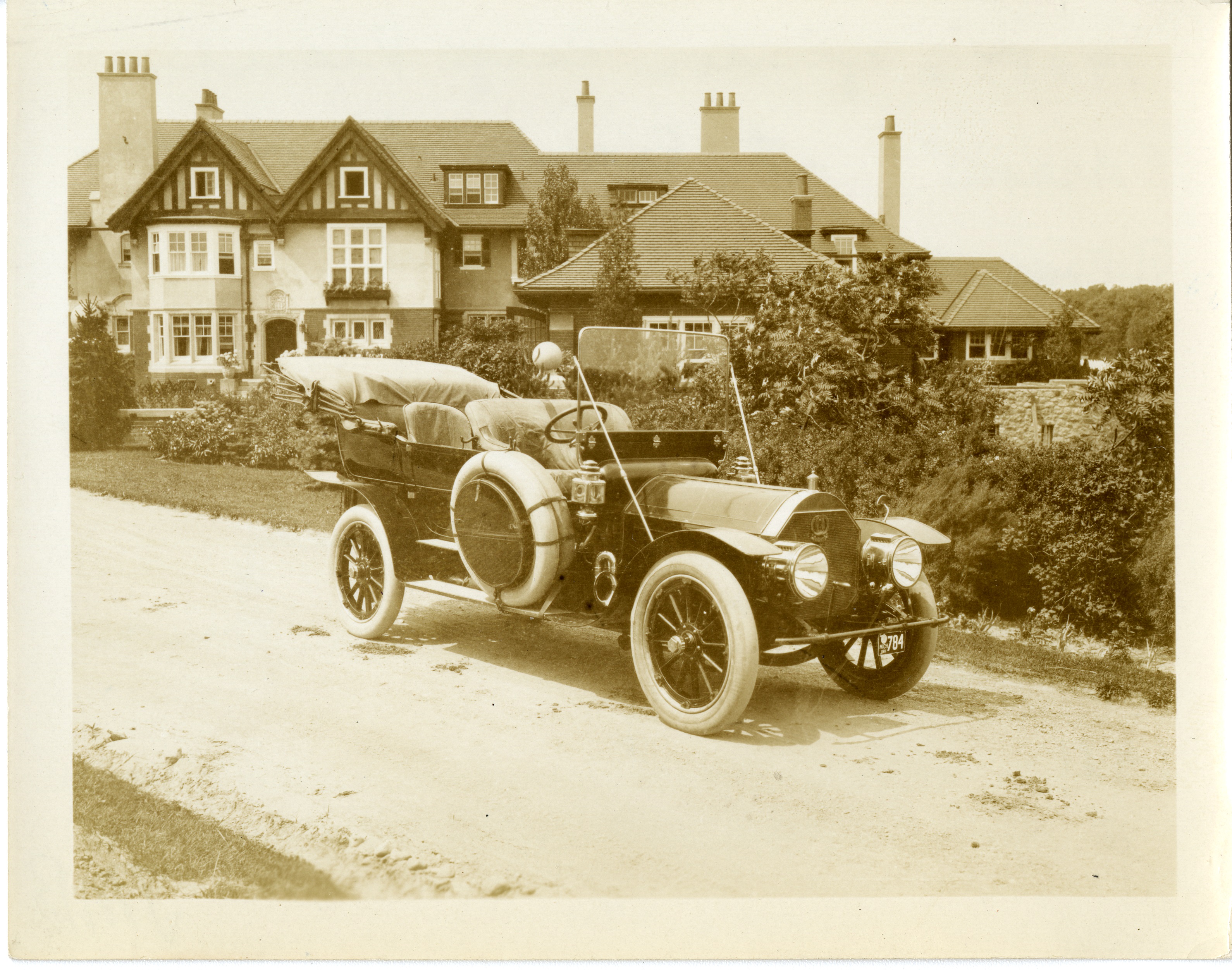 The Pierce-Arrow with its summer body in front of Cranbrook House, 1908. James Scripps Booth photographer, Copyright Cranbrook Archives.