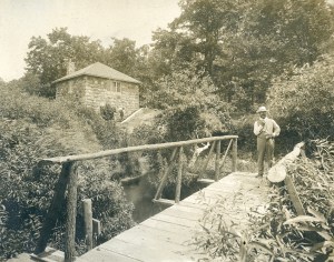 Unidentified man on bridge (no, it is NOT George Booth) with the pump house in the background, ca 1915